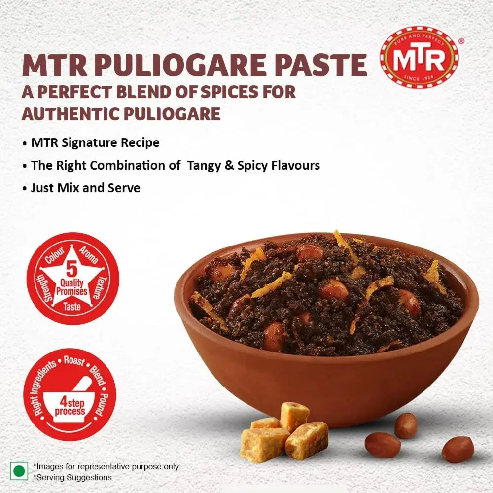 MTR Masala Paste - Puliogare Paste makes the yummy tamarind (imli) rice with peanuts in the authentic South Indian flavor tasty and peppery. MTR Daily Favorite is your reliable partner in the kitchen that assists you in making your family's each day meal tasty and healthy.
