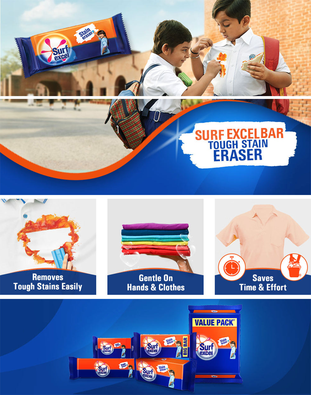 - Remove tough stains like tea, coffee, turmeric, curry, ketchup and chocolate with just 1 product-surf excel bar